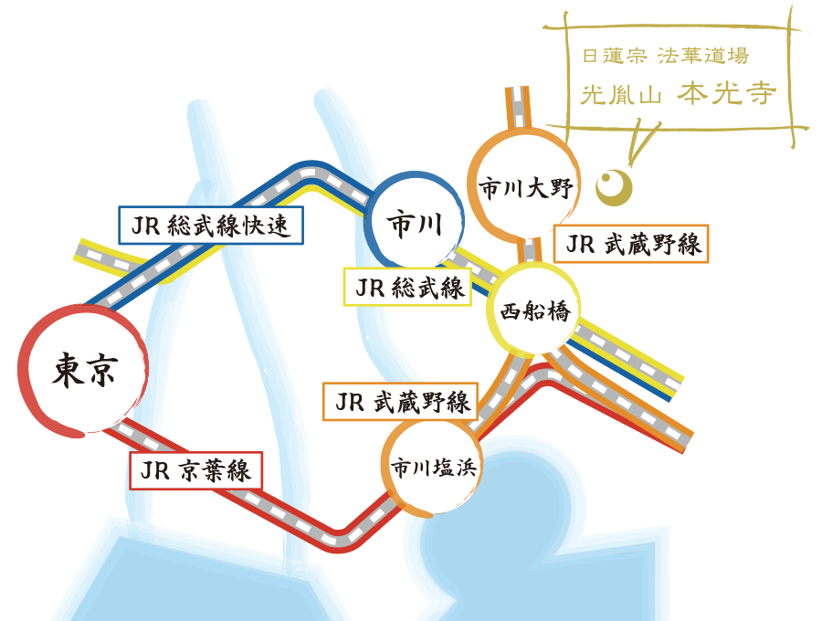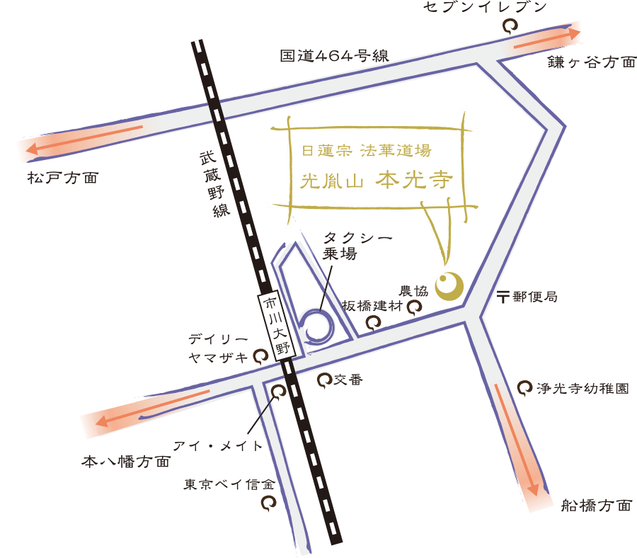 最寄りの駅はJR武蔵野線の市川大野駅です。改札口を出ましたら、目の前に走っている幹線道路を左の方へお進みください。徒歩3分で本光寺に到着します。尚、市川大野駅には改札口は一箇所しかありません。